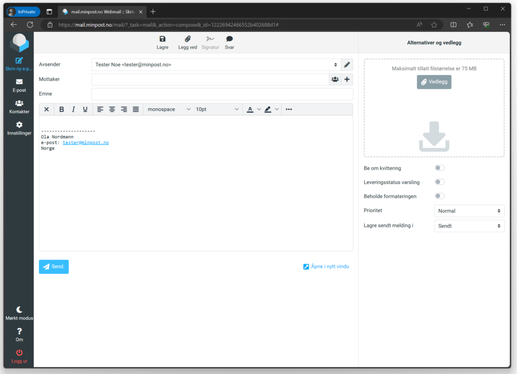 Vi tilbyr tradisjonell e-postkonto (IMAP) med RoundCube Webmail som standard på helt nye norske servere i våre to datasentre i Oslo.